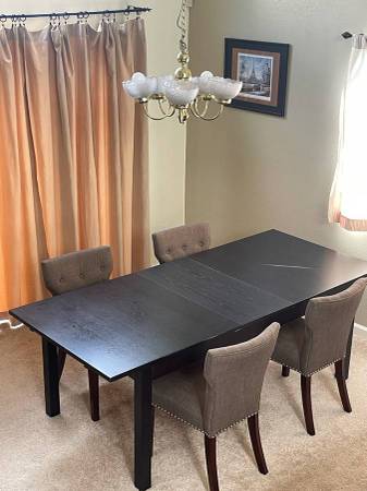 In great condition . 4 dining and extendable table chairs. 4 Dining Chairs (grey/brownish color) with tufted back and nailhead trim in great condition. Table has some marks and scratches from normal use for the table only. You can repaint the dining table if you want to turn it new again. Discounted so not perfect so possibilities are endless on your creativity to redesign them. Best offer so let me know what you are interested in the whole set. I am also selling both separately so please inquire