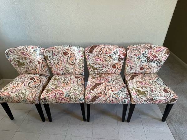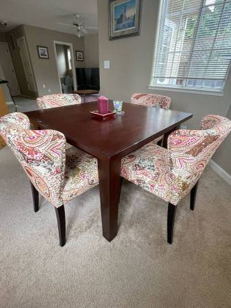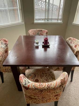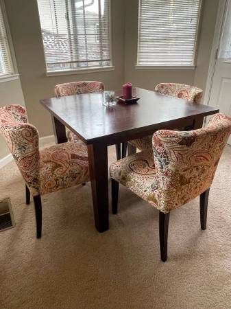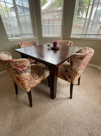 In great condition (some marks and scratches from normal use) This is part of the aged wood look of the table. See pixs.). Farmhouse/rustic country style so has that aged wood/imperfect natural look. MADE OF SOLID WOOD, not composite. Discounted since not brand new nor perfect. Dining table and (4) chairs (which is a complete and perfect size for most dining needs/households. You can repaint or restain the wood of the dining table if you want to turn it new again. I preferred the age look myself. Discounted so possibilities are endless on your creativity to redesign them.