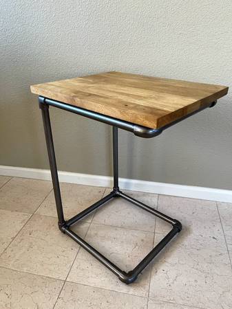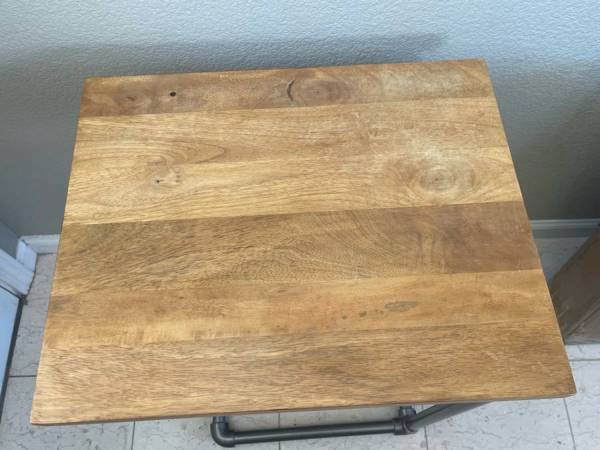 West Elm Mango wood and Steel Pipe Side Table. Solid mango wood top. Raw steel frame. Stylish timeless design to decorate any room