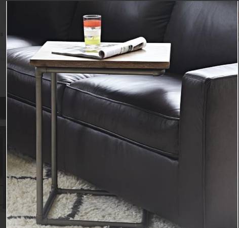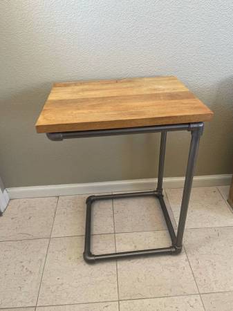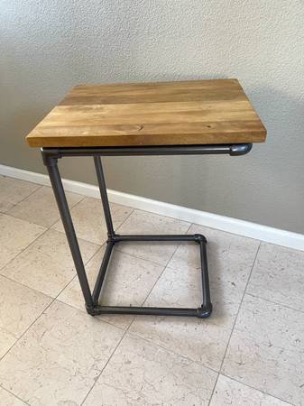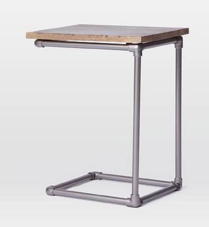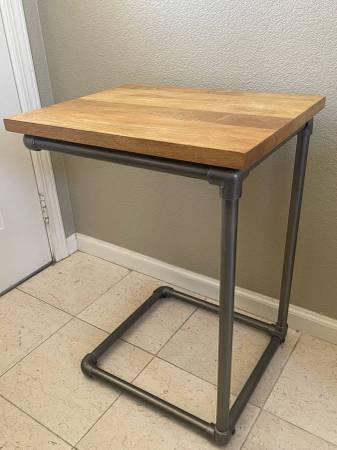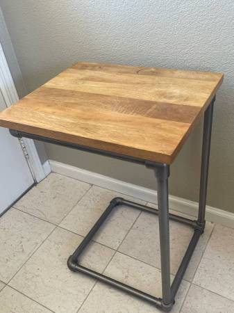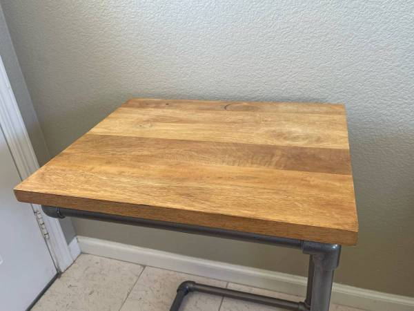 West Elm Mango wood and Steel Pipe Side Table. Solid mango wood top. Raw steel frame. Stylish timeless design to decorate any room