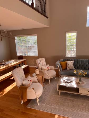 This special an luxury sofa set was made and shipped from Europe. It is all hand crafted and custom made. I have purchased from Europe. It barely used like new basically. It has been in my guest room. No any damages, stains or a single spot. It is also from extremely clean house, no pets, no shoes, no smoke house. Moving to smaller house and just have no room for this elegant set. I originally purchased the set for $10k +tax+ 1,500 for shipping to the USA. Selling for a good price. Length: 8’5”