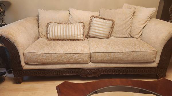 Livingroom furniture set includes one sofa and onr loveseat in nice beige fabrik. Barely used, in very good condition.