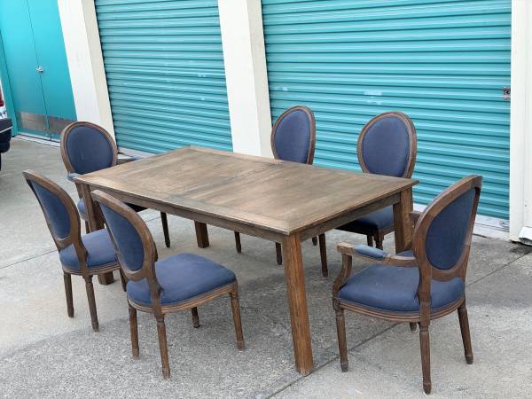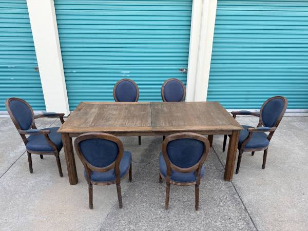 Selling a complete luxury dining package from Restoration Hardware. Entire set is in excellent condition. This is the "Vintage French" collection in a beautiful Navy/Indigo fabric with Weathered Oak wood finish.