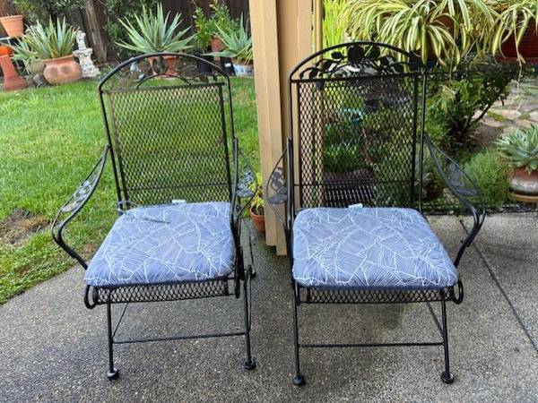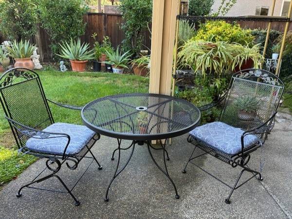 Beautiful wrought iron table with 2 matching chairs The entire set is sturdy and functional. Enjoy beautiful days in a porch, patio, or garden. The table is 40” across with umbrella hole. Price is...