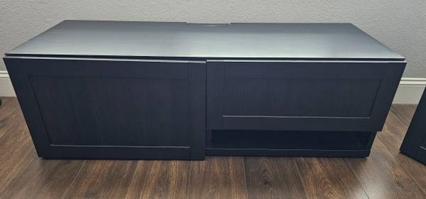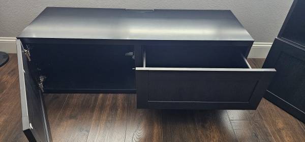 MINT CONDITION Outstanding black TV entertainment Center that features on the left, a large drawer for storage and on the right side a split cabinet/drawer with pro-grade hinge hardware. Unit is...