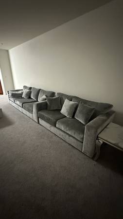 Selling my modern, comfortable couch (purchased new in April) — comes with all the pillows, coffee table, two blankets & two stylish marble side tables.