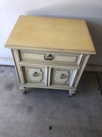 Solid Wood French Provincial Nightstand/End Table. Dovetail drawers. In very good condition. 23"w. 17"d. 26"h. $80 Cash Only for the set. Located in Vacaville. Call or Text