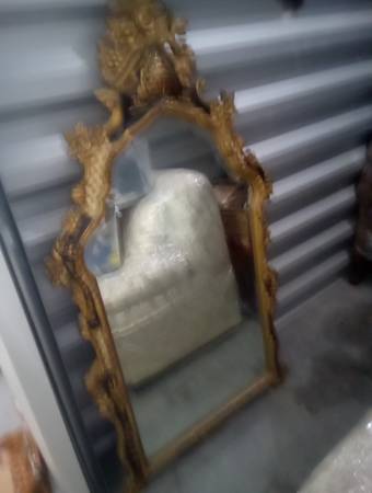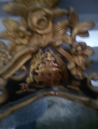 I believe this mirror is from the 1950s and is Decorative Chinoiserie Gold Gilt and Black Asian WoodenWALL MIRROR. Asking $300.00