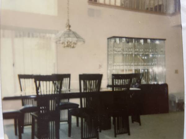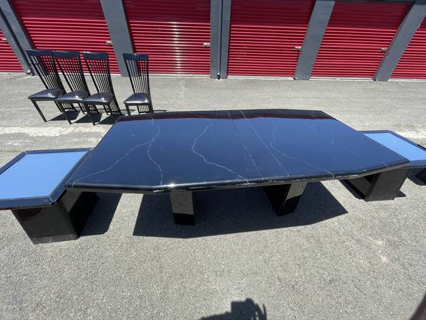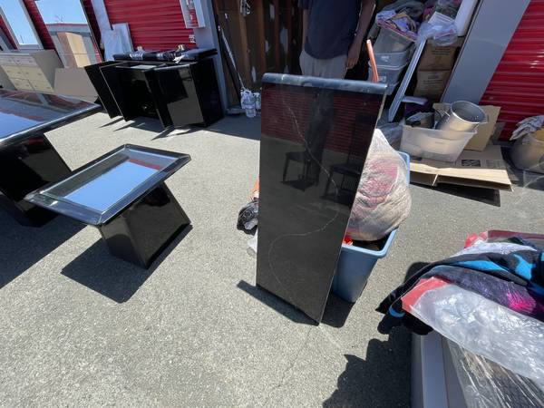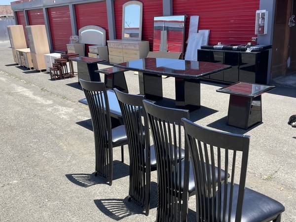 (1) Black table (heavy) that seats 6-8 people, has center leaf. Dining table has some scratches on side due to slight slide on concrete floor.