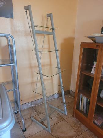 Contemporary ladder style shelf. 5ft H, 17 " W, 15" D at largest point.