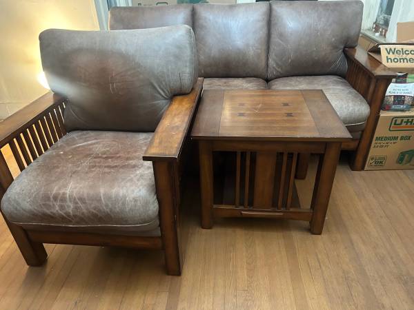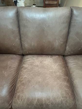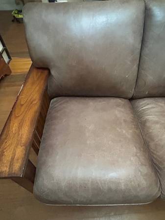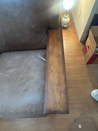 Couch - 36'' deep, 77.5'' wide 46" tall - Leather and wood, I don't know what kind of wood but it is really heavy the couch is in good to fair condition with some scratches and scuffs on the leather but no holes or tears