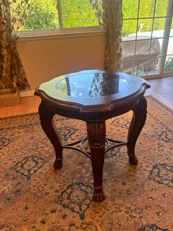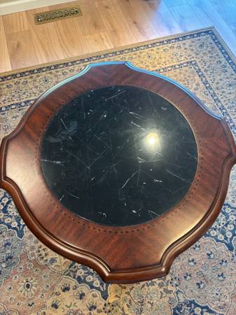 Beautiful round coffee table, end table - made from real wood with a black marble inset top. Classic carved details, sturdy curved legs, and a timeless walnut/cherry-tone finish. Looks great as a living-room end table, reading-chair side table, or bedroom accent.