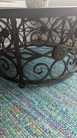 This is a nice big round coffee table that is in decent shape that could also be used for playing with toys. It is large, sturdy, and heavy, made of iron metal I suppose. It is 42.5" diameter X 21.5" high. The finish is a faux wood grain. It has light scratches and scuff marks but they are not immediately noticeable except in bright light.