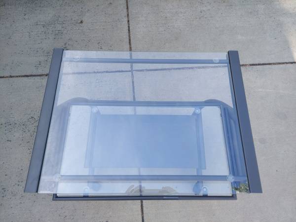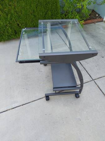 Glass topped rolling desk. Sliding center keyboard tray. The bottom tray also slides. Great for small office, a homework table or TV tray. Cash only.