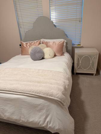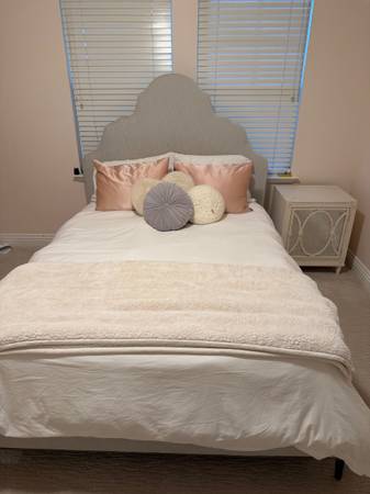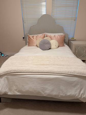 Beautiful Restoration Hardware Camilla upholstered queen bed in excellent condition. Upholstered in light gray performance velvet fabric on all sides. Metal base crafted of steel with aged brass...