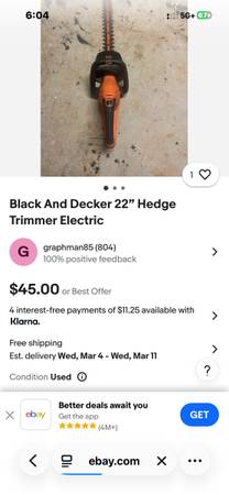 Black and Decker 22inch Corded 120 Volt 4.0 Amp 60 Hz Hedge Trimmer in Excellent Condition Going For Just $12. Won’t find it for less anywhere. Cheapest on eNay is $50/shipping included. Moving soon so I’m downsizing. Works like new. Powerful motor handles shrubbery and branches with ease. Test it on my front yard bushes if you’d like to see it in action. Located a few blocks from SouthShore Center in Alameda. Call/text anytime if interested..Alex