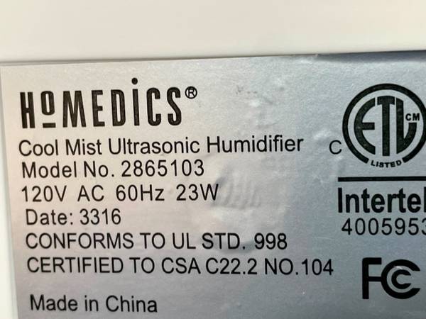 Brand New, HoMedics Cool Mist Ultrasonic Humidifier Comes complete and ready to use, includes user manual. Model# 2865103 Available Monday thru Friday in Hayward, Also available Monday thru Friday...