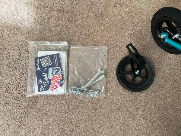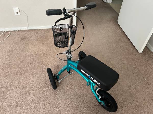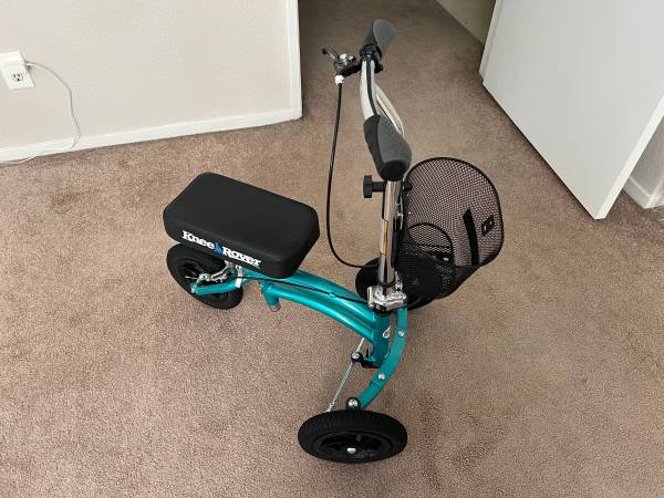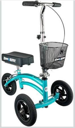 KneeRover Jr (designed for kids and small adults) knee scooter in Coastal Teal color. Fully assembled except for the additional stabilizer wheel, which is included along with assembly tools and manuals.