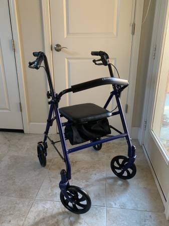 Foldable walker with padded seat in like new condition. Very clean. Used almost exclusively indoors.