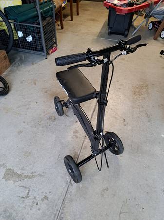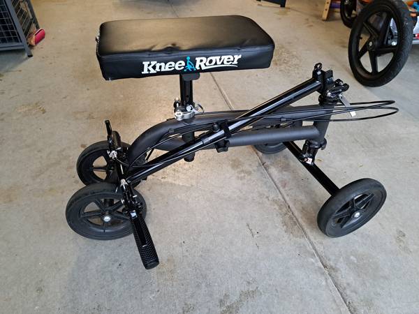 Classic Economy KneeRover for sale. Purchased directly from manufacturer this year, used lightly for 6 weeks while my foot healed this summer. Handle folds down to fit in the car. Everything works fine. Slight fraying on back end of cushion. This is the slightly older version with the straight vertical steering column, which does not have the issue users report with the current model where the steering column is out of alignment with the steering axle because the newer handlebars are set forward of the column (https://kneerover.com/collections/classic-series/products/economy-knee-scooter-in-matte-black). I found it very stable and reliable. Normally retails for almost $200 so this is basically an 80% discount for a lightly used product that you will hopefully not need for very long! The matte black color goes with any outfit. This is a great buy if you are anticipating lower limb surgery and want to to get set up and familiar with your mobility aids beforehand, or if you want to give this scooter as a gift to a relative with a hurt foot who lacks the cash to get something more user-friendly than crutches.