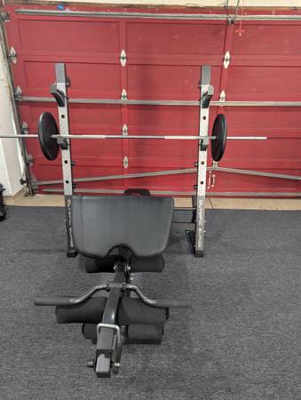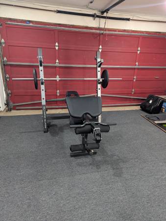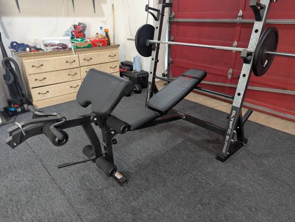 Bench press with Good Olympic brand, just like a New . Never used. Bench has multiple exercises such as a Bench press, incline press, Squad for legs. Leg extension, Biceps curls. Reverse curl for...