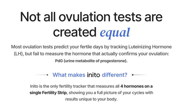Inito is the only fertility tracker that measures all 4 hormones on a single Fertility Strip, showing you a full picture of your cycles with results unique to your body. Get accurate results of Estrogen, LH, PdG (urine metabolite of progesterone) & FSH with Inito, the all-in-one fertility tracker.