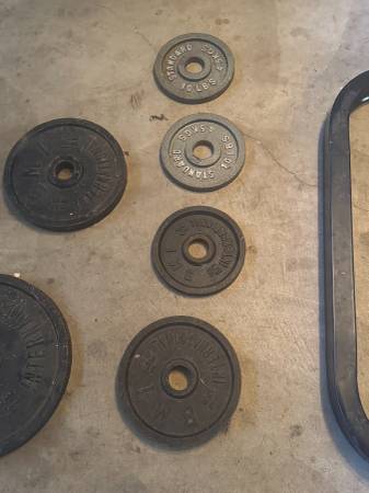 Selling some weight plates - 45 IBS (2) - $50 / each - 35 IBS (2) - $40 / each - 25 IBS (1) - $30 - 10 IBS (3) - $15 / each - Olympic Barbell (1) - $150 - Barbells (2) - $50 / each 505 - Olympic...