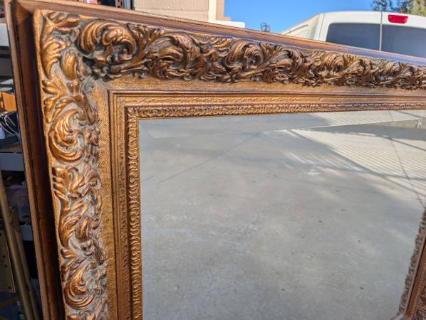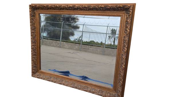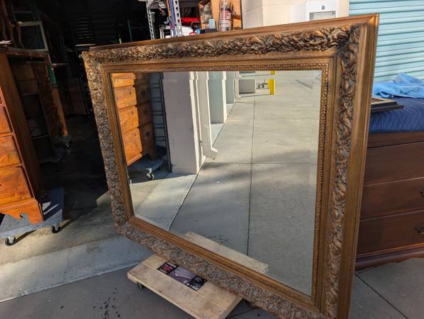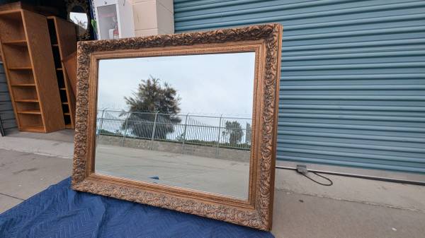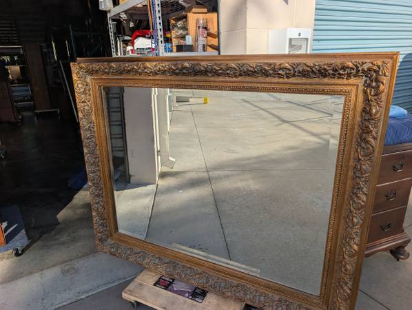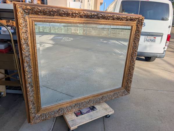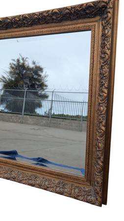 Heavily Carved Gilt Wood Framed Bevelled Glass Wall Mirror. Extra large Can be hung vertically or horizontally 58.5Lx46.5H or 46.5Lx58.5H Instagram: Mid.centurymike Cash or Zelle IN PERSON Venmo...