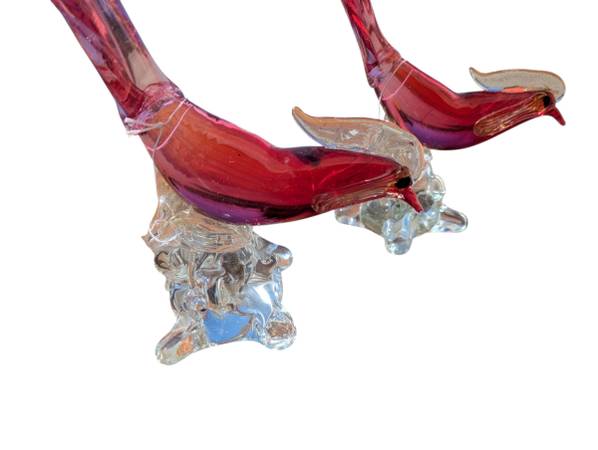 Each bird is perched on a clear sculpted glass base, designed to resemble natural rock or ice formations, providing stability and visual contrast to the vivid red tones.