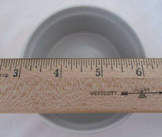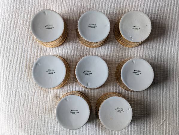 About 3" diameter, 1 3/4" high White dishes with gold outer glaze Made in France Do not know if these are dishwasher safe Price is as listed, do not make an offer. Payment: cash, paypal or Venmo....