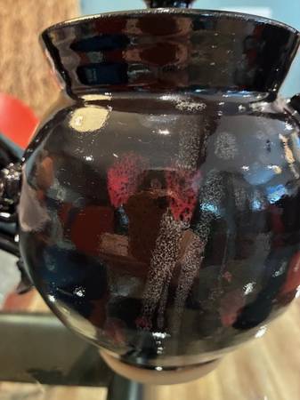 Handmade ceramic pottery teapot with unusual detailing. It is a rich deep brown, with subtle red and white glaze details. Includes ribbon-like detailing on its ceramic handle. Holds 48 oz (6 cups)....