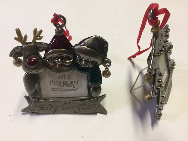 Set of 2 lovely ornaments that are also picture frames; one is a decorated tree, the other Santa, Reindeer and Elf. Adorable. 4" x 4" Cast Metal