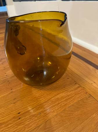 large round amber colored glass juice water pitcher approx 9” tall and 6” diameter some marks but otherwise good condition see my other listings for more household items