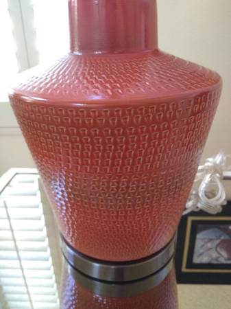 The set in magenta red color features brass and ceramic stand 10" diameter x 13"H. The shade is 14" diameter. Total height of the lamp is 26".
