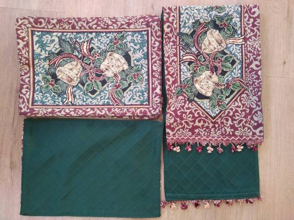 Stylish 1 table runner and 6 placemat in holiday designed with gold glitters, thick and padded. Table runner measures 74" x 12". Placemat measures 17.5" x 12"