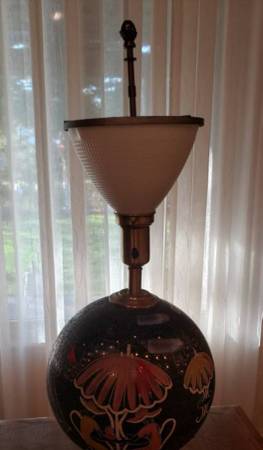 Gorgeous Atomic Age ceramic table lamp made in 1954 by Tye of California, excellent condition, no chips, scratches, etc. electrical wiring works well, an homage to Fauvist artist Raoul Dufy who died in 1953, signed and dated, the Paris city scene on the sphere lights up through small holes in the ceramic base to highlight the Eiffel Tower, a cafe, the sky, etc., the original glass fixture at the top houses a single light bulb, you can illuminated the top and bottom lights simultaneously or just one at a time, the original metal lamp shade holder sits on the top of the glass fixture and the original finial is at the top, all you will need is to buy a lamp shade of your choice, my memory is that the lamp shade was round and a thin white fabric perhaps with a subtle geometric design, the lamp measures 32 inches tall and 13 inches wide, pick up in Danville, no shipping, cash only.