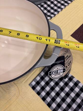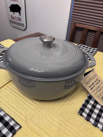 Nice grey ombré Brandani Italy 6.3 quart Dutch oven with drip roaster lid. Cast iron and enamel. New with labels. If interested please call. Don't text or email. Won't respond to you. Local pick up....