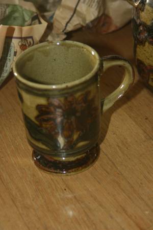 New - never used Brown leaf and flower pattern Mugs wrapped in 1991 newspaper Teapot still has styrofoam insert where creamer was stored.