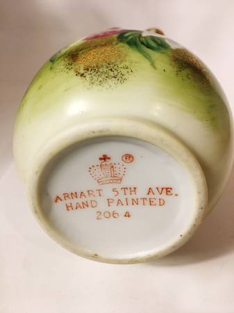 1950s Arnart 5th Ave Hand Painted Vase Gilt, 5th Ave, 2064 In Excellet condition. Hand painted mint-green, semigloss ground with a splatter-gilt edged lip. Pick up only, please respond with your...