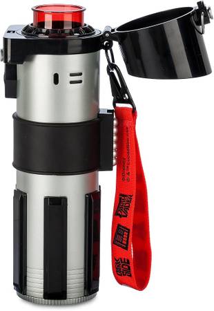 When you're battling a strong thirst, you'll be thankful to be able to reach for this water bottle inspired by Darth Vader's Lightsaber hilt. The detailed design includes a light-up translucent red spout based on the color of the Dark Lord's Lightsaber blade. It also includes authentic Lightsaber sounds and a flip-up lid angled just like Vader's hilt. There's even a detachable wrist strap for hands-free convenience and a removable inner bottle for cleaning convenience.