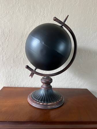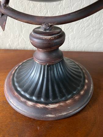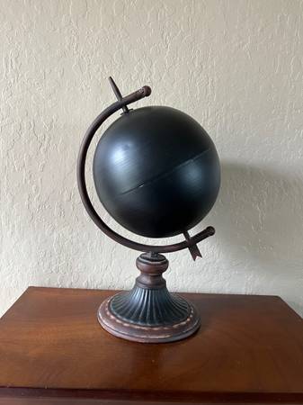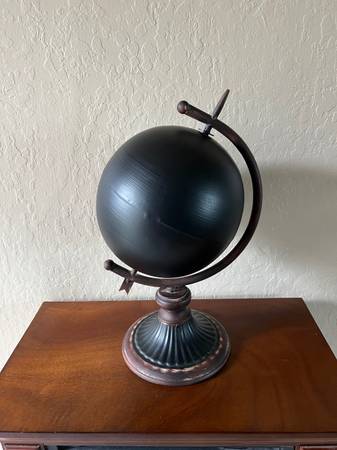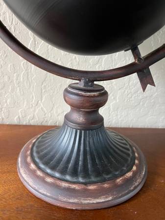 Great antique looking globe. Place this globe on any counter or table to show your love for traveling. Embark on an exiting adventure with this world globe decor. Display as an accent or centerpiece decor on your console, coffe, or office table. Description: plastic and metal. Dimensions 16”H x 9” W and 8” globe diameter. Serious enquirer and Cash only