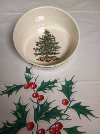 Here is a Spode Christmas Tree Souffle dish to add to your collectioThe Souffle dish is in excellent shape and was not used. We purchased the dish many years ago but I never learned how to make a souffle! It is a heavy piece, made in England and is oven-to-table ware ready and also dishwasher safe. The Souffle dish is round and 7 inches in diameter. The Spode Christmas Tree design is a reproduction from copper plates created in 1938 (See backstamp.) The Souffle Dish is nice and glossy, and in great condidtion!