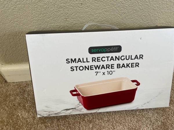 BRAND NEW. Never Open. Brand new in box. Beautiful 7” X 10” Rectangular Stoneware Baker. Red. Molded in handles for easy movement in and out of the oven. (Sample shown in pics only is Blue version. My unopened box is RED)