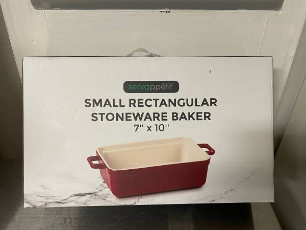 BRAND NEW. Never Open. Brand new in box. Beautiful 7” X 10” Rectangular Stoneware Baker. Red. Molded in handles for easy movement in and out of the oven. (Sample shown in pics only is Blue version. My unopened box is RED)