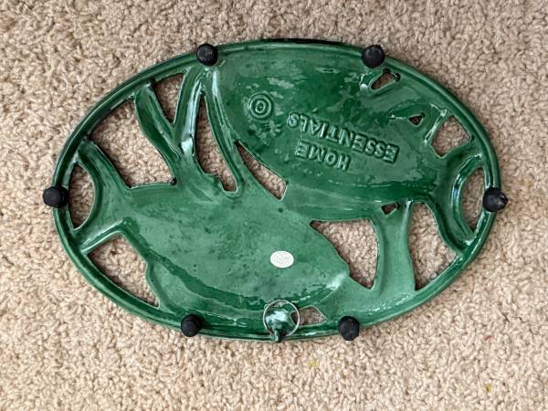 New Vintage emerald green cast iron fish trivet, featuring two fish swimming. Material: Cast iron. Design: Oval shape with two fish, possibly coy fish or trout. Purpose: Used as a hot plate or...