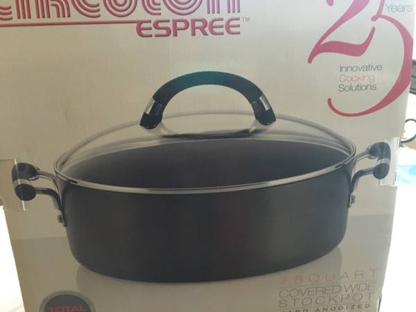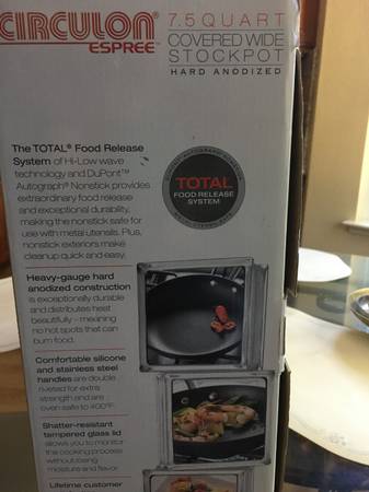 Brand new Big Circulon 7.5 quart wide stock pot with glass lid. Still in the original package. $50