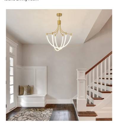 For sale, new in box, not opened, Modern Stylish Chandelier with Brushed Brass and LED. Remote control. Dimmable. This is $279 new. Asking $200 Located in Vallejo