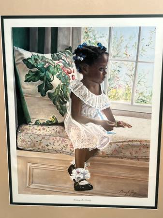 Beautiful lithograph by artist Merrill Jaye, titled “Waiting for Daddy.” This moving piece depicts a young girl in a white dress, waiting by a window, full of warmth and innocence.