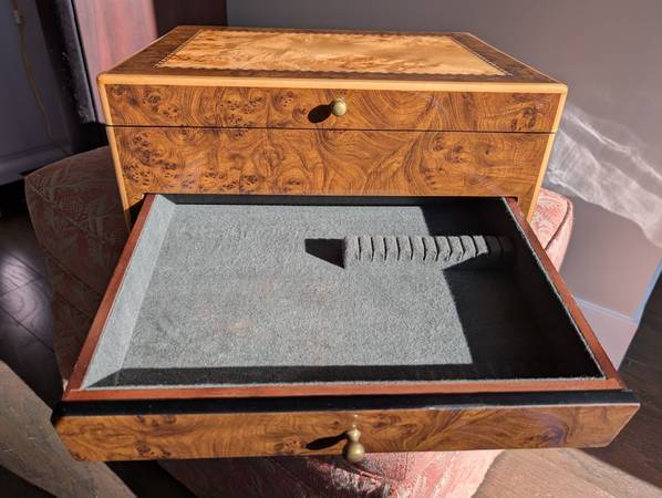 Used hardwood with a burl inlay silverware flatware storage chest Velvet lined One drawer and top storage In excellent condition Asking $150 OBO