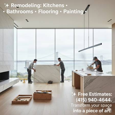 kitchen remodel, bathroom remodel, flooring, LVP, laminate, hardwood, tile, backsplash, quartz, cabinets, painting, drywall, waterproofing, subfloor, baseboards, doors, trim, contractor, renovation, Bay Area. Remodeling & Home Building, Commercial & Residential, Kitchen Remodeling, Bathroom Remodeling, Backsplash Installation, Basement Remodeling, Home Remodeling, Home Improvement, Home Innovation, Home Addition, HVAC, Air Conditioning, ADU (Accessory Dwelling Units), New Home Construction, Tile, Flooring, Door, Window, Painting, Carpentry, Cabinet Painting/Refinishing, Carpet - Repair/Refasten, Chain Link, Fence Install, Concrete Applications, Concrete Foundation - Install, Countertops - Install, Electricians, Electrical, Fence, Gas, Piping, Kitchen & Bathroom Remodeling, Landscaping, Lawn Sprinkler Systems, Painting - Exteriors, Painting - Interior, Plumbing